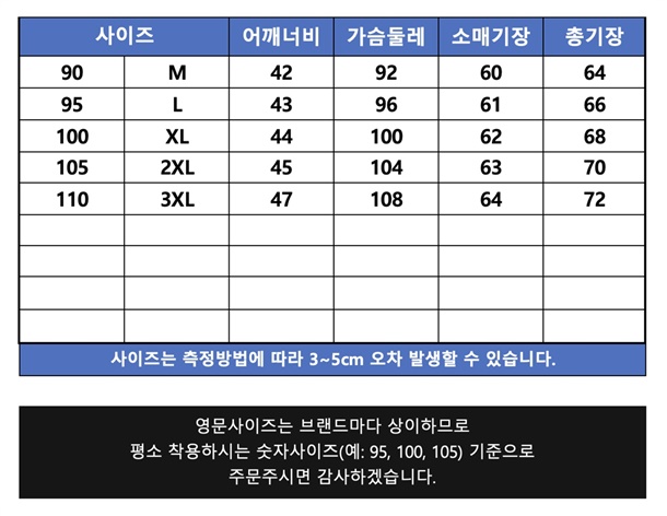 90(M),95(L),100(XL),105(2XL),110(3XL)